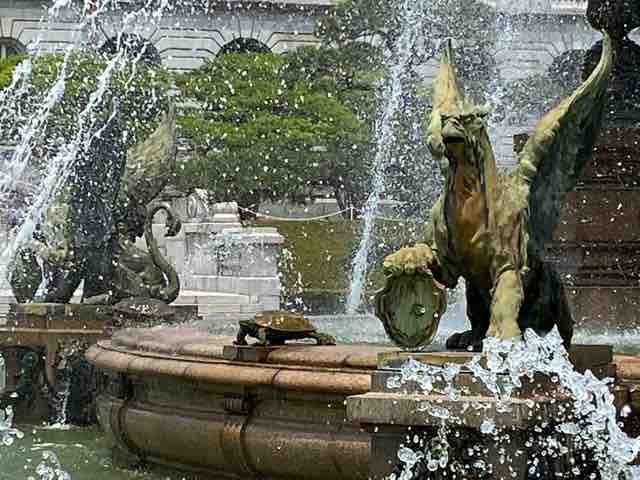 特に噴水には西洋の幻の生き物グリフォンの隣に