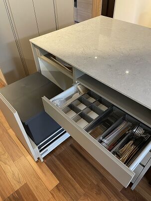 多くのオーダーキッチン屋さんが引き出し内にゴミ箱を収納する場合は、海外のゴミ箱が入る寸法で作られていますが、こちらのキッチンは無印良品の45リットルタイプの”蓋付き”ゴミ箱を2つ並べて収納できるのです。これがまさにお施主様の求めていたポイントの一つ。