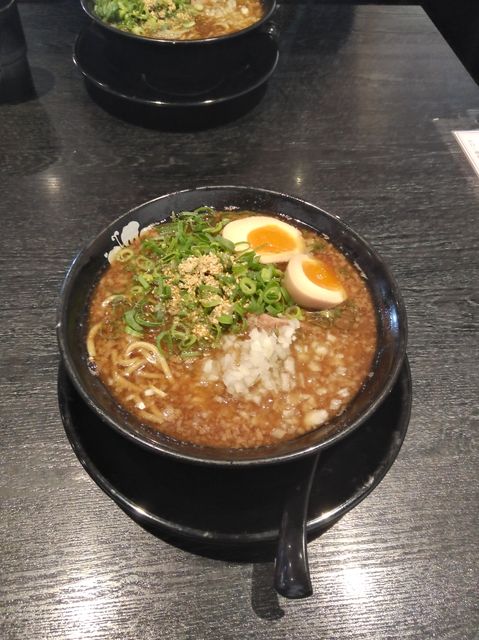 ラー油とサービスの生卵を入れて食べます。